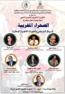 مشاركة المركز المغربي للعدالة الإنتقالية ودراسة التقارير الدولية في الندوة لفاءدة تلاميذ الثانوية التأهيلية المنصور الذهبي التابعة للمديرية الرباط، حول موضوع: “الصحراء المغربية: السياق التاريخي وتطورات القضية الوطنية”، وذلك يوم السبت 12 نونبر 2022 على الساعة العاشرة صباحا.