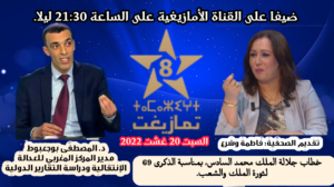 يحضر مدير المركز المغربي للعدالة الانتقالية ودراسة التقارير الدولية، ضيفا على القناة الأمازيغية لمناقشة الخطاب الملكي، بمناسبة الذكرى التاسعة والستين لثورة الملك والشعب، الذي سيوجه صاحب الجلالة الملك محمد السادس، نصره الله وأيده، وسيبث الخطاب الملكي على أمواج الإذاعة وشاشة التلفزة ابتداء من الساعة التاسعة من مساء يوم السبت 20 غشت 2022.
